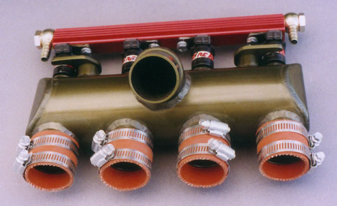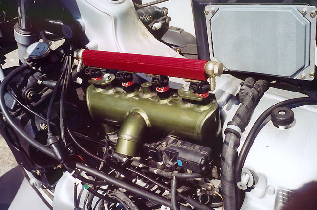 Fuel system upgrades to the K1200RS Turbo have been tested. K1200RS kits now use 8 new injectors: 4 additional injectors controlled by our RSR AIC400 and 4 injectors to replace the oem injectors. We found we could improve the stock diveability and further refine the mixture of the Motronic N-Alpha and our Speed-Density AIC controller for even more driveabilty. Pictured above is one of the latest generation plenums with Formula 1 style additional injector placement.