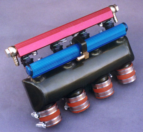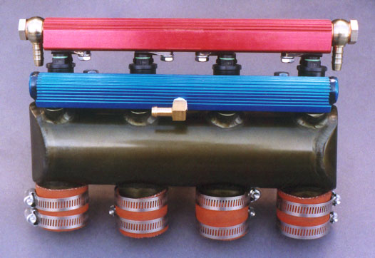 The newest plenums are heliarced 6061 aluminum with mil-spec hard coat anodizing to resist water/alcohol mixtures. Both the fuel rail (red) and the water injection rail (blue) are anodized for long term protection.