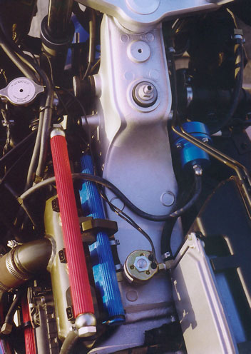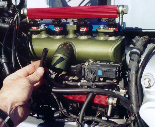The fuel bypass or return line to the tank has been extended with a short piece of fuel injection line and two extra clamps. The feed line which comes from the rear of the upper or secondary injector rail is routed to the side of the regulator. The nipple on the top of the regulator will be attached to the vacuum/boost lines that are connected to the area beneath the four butteflies in the throttle bodies.
