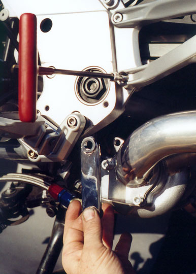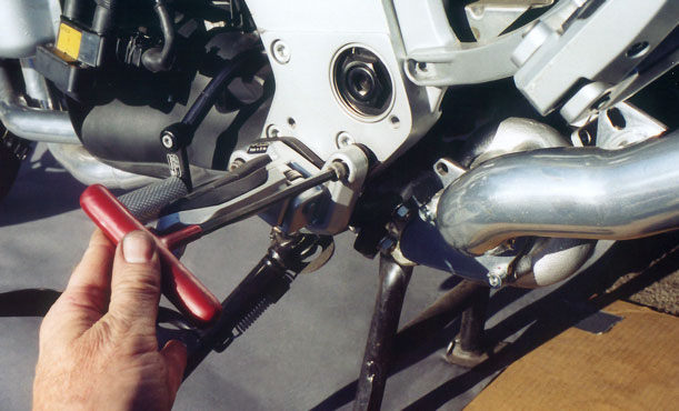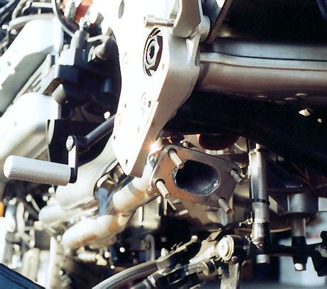 The eight nuts that hold the header to the motor should only be lightly tightened. These will not be tightened until the turbo, the air cleaner and bracket and the footpeg support bracket are in place.