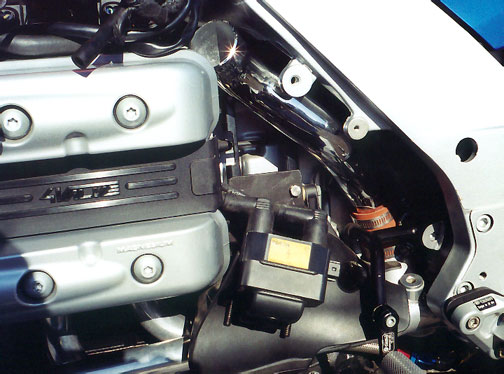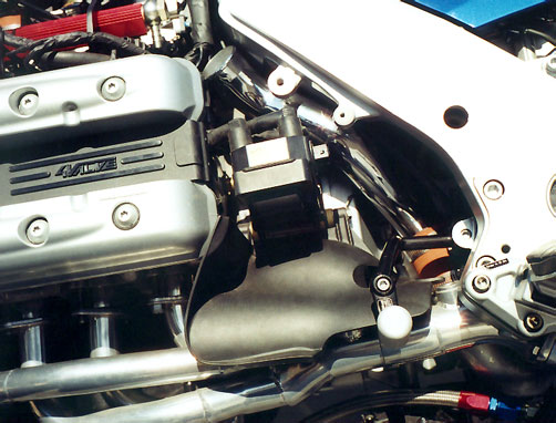 The ignition coil pack is loosened and dropped down. We will be relocating it a bit as it interferes with our turbo plumbing. The stock coil wires are unchanged and we provide a new bracket for the relocation. Note that the foopeg casting has been removed...We have plans for this area that we will show you later.