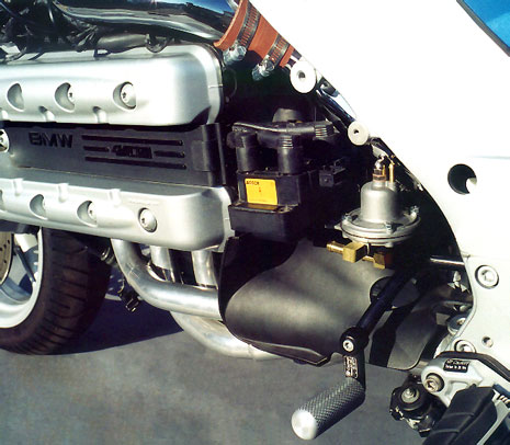These changes represent small but beneficial improvements over those parts pictured on the earlier 1997 model K1200RS. We have incorporated what we have learned form our Black Hole Muffler testing into the fuel and sound control on all our K1200RS turbo kits. Pictured above are our new oil lines for feed and scavenge. We had to go to a combination hard line and braided stainless on the feed to account for changes BMW has made between the 1997 and 2003 models. We can't tell you how much work all this is.