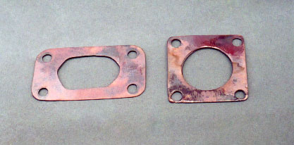 Copper gaskets for the wastegate and turbo. The connection between the turbo and turbo exhaust manifold gets a rectangular 4 bolt annealed copper gasket. The square annealed copper gasket goes from the turbo to the wastegate base. Copper will not leak or blow out and can be reused. We machine these, heat them cherry red and then quench them in water to make them soft. Stainless steel fasteners hold the surfaces tight.