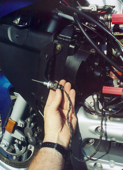 This is your air temperature sensor that you will remove from your plastic inlet chamber. It has a two wire connector (Brown/Yellow Stripe; Brown/Blue Stripe). The lead wire is long and you will use two plastic tie wraps to secure it to a fairing support tube behind the large black plastic shroud ahead of the radiator. In this position it will sense ambient air but will not see the compressed inlet air from the turbo.