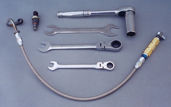 AN4 oil feed line and necessary tools. It takes a 24mm deep socket to remove the oem oil pressure switch from the lower left side of the engine. It takes also a 3/4", a 9/16", and a 24mm wrench to tighen things. We machine a special banjo bolt that accepts the oem oil pressure switch as well as feeding oil to the turbocharger. We ship these assembled but we ask that you be absolutely sure no dirt or debris has gotten into the line before you install it. These banjo bolts can be overtightened and damaged so don't use a lot of leverage on them. Teflon tape is only used on pipe threads, not straight threads.