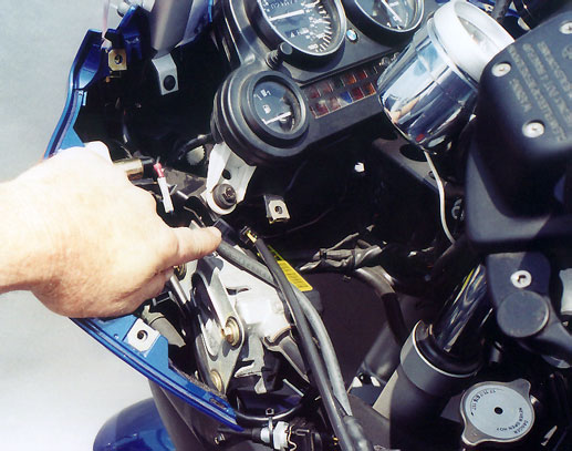 Use a plastic tie wrap to secure the air temperature sensor here, above the plastic radiator shroud away from the radiator heat but with exposure to the air coming up under the fairing nose.