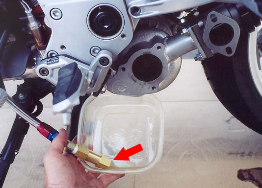 If you start the bike with this line "open" it will suck air into your main system instantly. We block off the fitting so that when we start the bike you can check for oil leaks on the pan, lines and fittings as well as verify oil flow through the turbo. You should verify oil level in the sight window on the other side of the bike as, once the bike starts, things like the oil filter and the various lines and passages will fill up. You will have to immediately check this to bring the oil to the proper level in the sight window. We have made a video of the oil scavenge testing (see below).