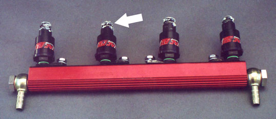 Arrows right to left. The first arrow points to where the the vacuum/boost signal is taken from the throttle bodies and leads to the fuel pressure regulator hat. Fuel pressure is pre-set at RB Racing for you, but is user adjustable. Fuel pressure tracks boost pressure on a 1:1 basis. The oem pressure regulator does not track manifold pressure. The second arrow points to the source of the "boost only" circuit. The third arrow points to a brass "t" which leads to the Hobbs Switch that turns on the water injection. This switch resides atop the fan shroud. The fourth arrow points to the location of the Hobbs switch that activates the water injection.