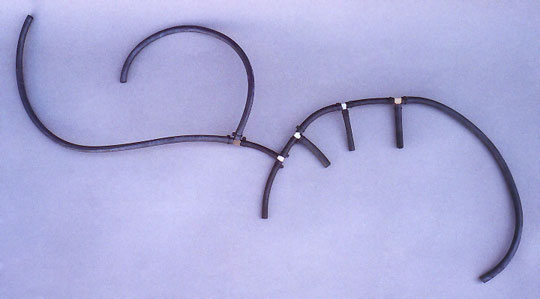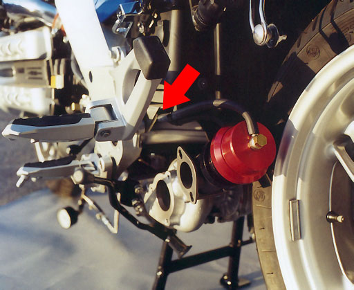 Pneumatic lines (2) to the wastegate are 7/32" vacuum lines. The "boost pressure only" is routed to the side of the wastegate. The line to the top of the wastegate is connected to the exit of the pneumatic dial-a-boost controller. The two hoses are held together at various points along their journey with small plastic tie wraps. Their first entry into the underworld is beneath the stainless steel sheet metal battery /abs box, and then over the top of the swingarm casting, past the Popes upside down in the burning mud.
