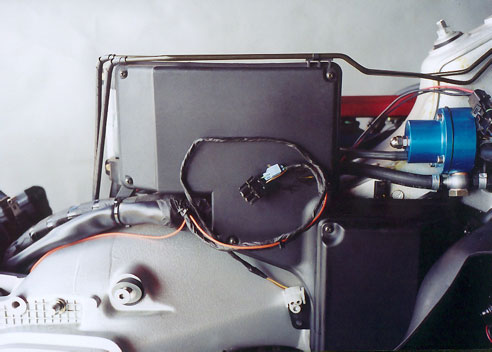 This shows the postion of the new plenum chamber that has the four-port water injection. We'll be showing you how this all hooks up. The box to the right is your Motronic Ecu.