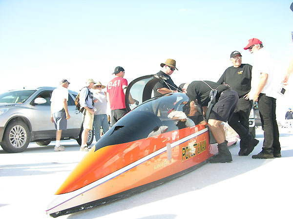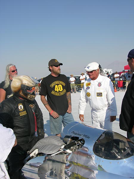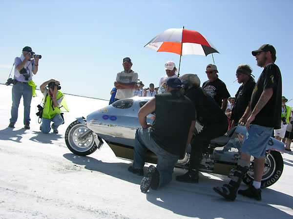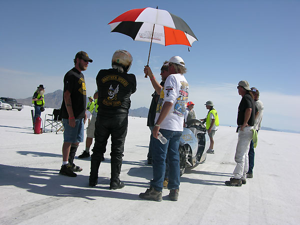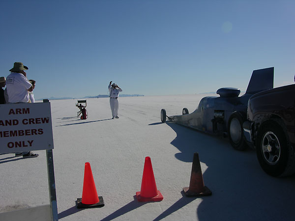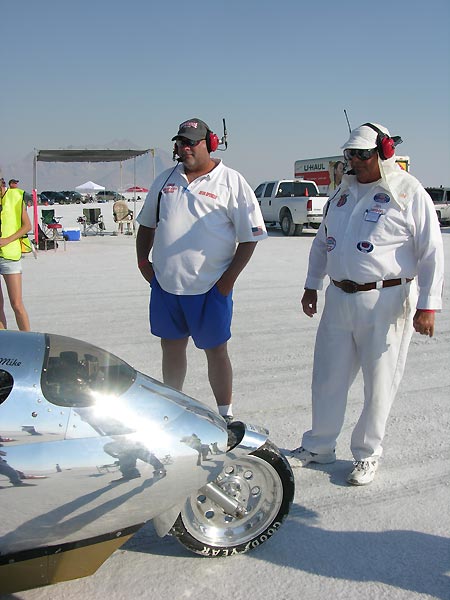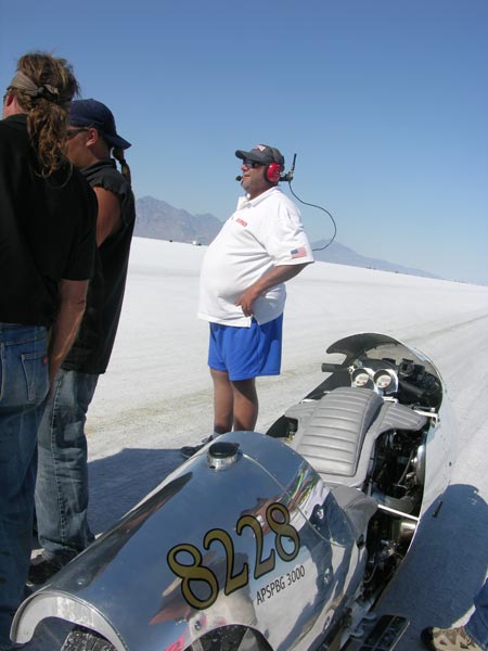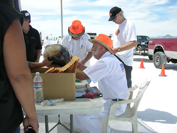 Once you get to the line the man in charge is God..he tells you when to start, when to go and will check your girth to see if it matches his. He keeps and eagle eye on your safety gear and advises you of course conditions and, in general, tries to keep a serious business somewhat light, if going 200 mph on slippery wet salt is a normal occupation.