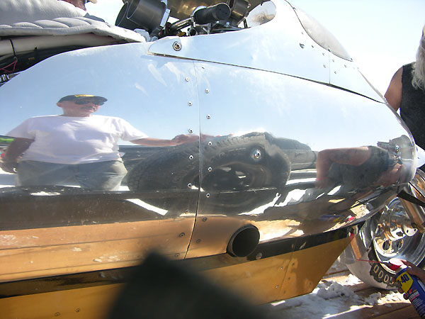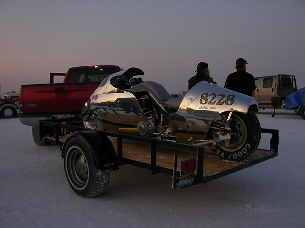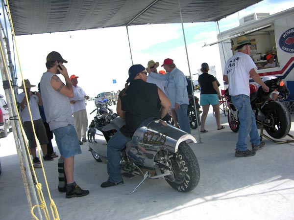 After a 199 mph pass on wet track, the Bullett sits in impound awaiting the return run for record. The exhaust burn is seen on the fairing. The plugs looked a bit rich, the boost was low, and the EGTs were showing 1530F or so, so things were safe. You have exactly four hours to do maintenance.
