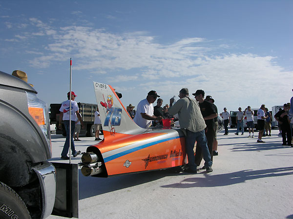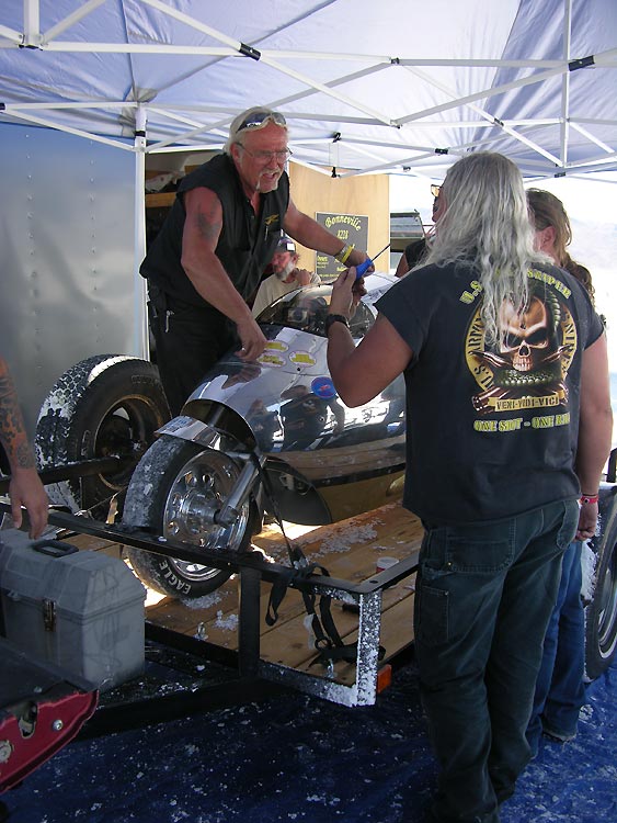 Headed for record run again after another 193- 202 mph pass on wet slushy salt... Back at the line Frank, Jesse, Scott, Blaine, Bryan, Nick, Mark and Walt...Every vehicle has a crew. This isn't Formula 1 where you need 100 million dollars and a FOCA pass. We're up on the line with racers like Poteet and Main and Seth Hammond. Long course with the big dogs and Bryan qualified for 200 mph plus speeds. 1000 lbs of bike, wet salt, 320 hp @ 15 psi, and a crew of volunteers. Black and Gold and full throttle.