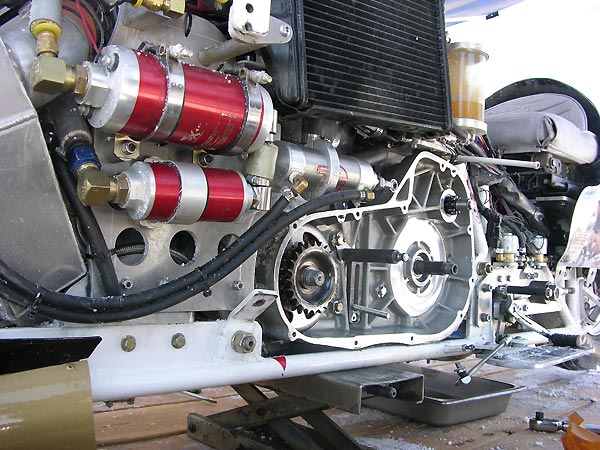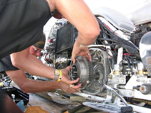 Headed down the course Bryan hit a bump that shook the Bullett and snapped the primary chain. Bryan was hitting 15 pounds of boost, launched the bike over a bump, and saw the horizon go left to right and suddenly..."bang"...and no power transmission. We got really lucky, as the primary was neatly coiled up behind the inspection cover like a snake, and could have damaged the bike or put Bryan down. Shit happens.