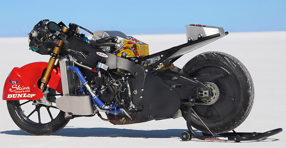 Mike Geokan's Bonneville Bullet. 139" Watercooled ORCA engine. Dry sump engine (Harley) and Dry Sump Oiling system for the larger Garrett turbocharger. Check out Mike's progress as he goes for Bonneville speed records. Viet Nam Vet. Uses 03-1034 electric turbocharger feed pump. Mike has used electric oil pump systems from RB Racing for 25 years.