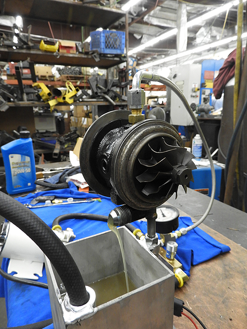 Garrett GT series ball bearing turbos only need about 9 to 30 psi of oil pressure so their flow rates are less than plain bearing units. We use a separate oil system to feed the ball bearing turbo on the Bullett race bike.