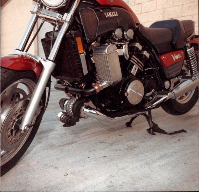 No cutting is required on the RB Racing Yamaha V-Max Turbo. Only the oil pan needs to be modified for the oil scavenge system. The turbo discharges into twin intercoolers. Yamaha's phony air scoops remain phony as ever.